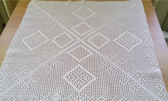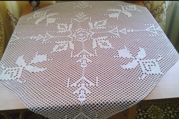 Одной из рукодельниц подарили мою книгу с филейными квадратными мотивами. Книга понравилась и по ее словам она «полностью ушла в работу». Появилось желание связать скатерть. Стал вопрос каймы. Тогда женщина нашла меня в соц. сетях и обратилась с просьбой нарисовать схему для каймы. Просьбу выполнила.