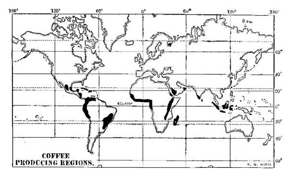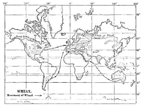 There is scarcely a country in the world that does not yield something or other to civilized peoples. There is scarcely a household whose furnishings and contents do not represent an aggregate journey of several times around the earth. A family in New York at breakfast occupy chairs from Grand Rapids, Mich.; they partake of bread made of wheat from Minnesota, and meat from Texas prepared in a range made in St. Louis; coffee grown in Sumatra or Java, or tea from China is served in cups made in Japan, sweetened with sugar from Cuba, stirred with spoons of silver from Nevada. Spices from Africa, South America, and Asia season the food, which is served on a table of New Hampshire oak, covered with a linen spread made from flax grown in Ireland or in Russia. Rugs from Bokhara, or from Baluchistan, cover the floors; portières made in Constantinople hang at the doors; and the room is heated with coal from Pennsylvania that burns in a furnace made in Rhode Island.