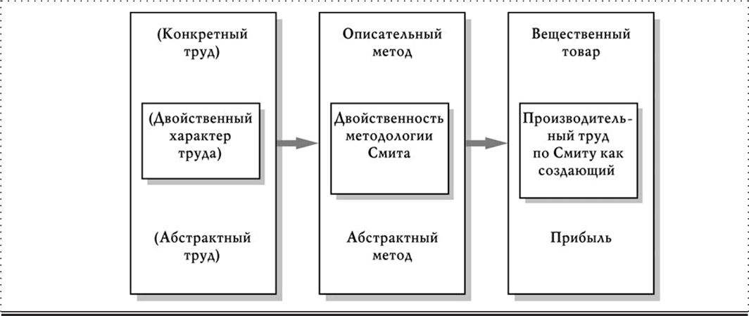 Однако Смиту была неизвестна двойственная природа труда товаропроизводителя, его разграничение на труд конкретный (полезная форма труда, создающая потребительную стоимость товара) и труд абстрактный (затраты общественного труда, определяющие стоимость товара)[25]. В результате этого в одних случаях он рассматривает экономические явления с позиции конкретного труда и в итоге получает ряд теоретических трактовок, отражающих лишь внешнюю видимость этих явлений, а в других – он исследует те же самые явления с точки зрения абстрактного труда, что позволяет ему разработать другой ряд теоретических позиций, отражающих сущностные свойства этих экономических явлений (рис. 3).