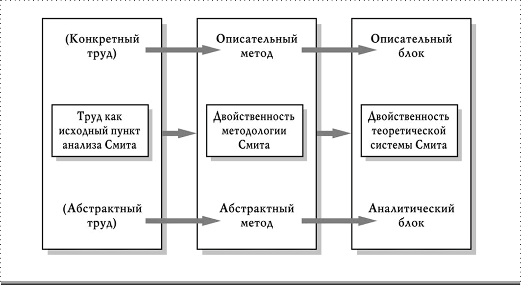 Недостаток же теории Смита состоял в том, что он ставил на одну доску те различные результаты, которые он получал с помощью различных методов исследования, смешивая содержание экономического явления и его внешнюю форму, которая выступала в его теории как некая «вторая сущность». В результате двойственность примененного Смитом метода обусловила и двойственность всей его теоретической системы. С помощью описательного метода Смит получал достаточно цельную картину общественно экономических отношений, какой она выглядит на поверхности явлений экономической жизни общества. Абстрактный же метод, примененный Смитом, позволял ему разработать другой теоретический блок, отражающий свойства той же самой экономической системы, но уже с точки зрения ее сущностных закономерностей.