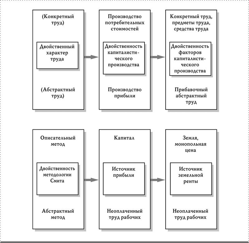 Тем самым Смит впервые в истории экономической мысли применил, хотя и противоречиво, специфический метод экономического анализа – метод экономической двойственности, без использования которого ничего нельзя понять в экономических явлениях и их законах. Этот метод используется только в экономической науке и представляет собой конкретизацию общенаучных методов исследования с учетом специфики предмета политической экономии. Метод экономической двойственности позволяет научно объяснить внешнюю видимость экономических явлений с точки зрения их сущностных свойств, а также выявить как внешние функциональные зависимости между этими явлениями, так и их сущностные закономерности.