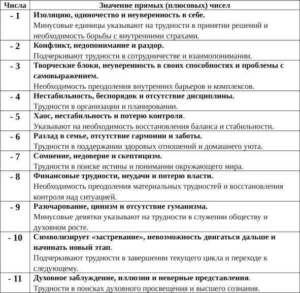 Прямые числа подчеркивают позитивные аспекты и возможности, тогда как минусовые числа указывают на трудности и препятствия, которые необходимо преодолеть.