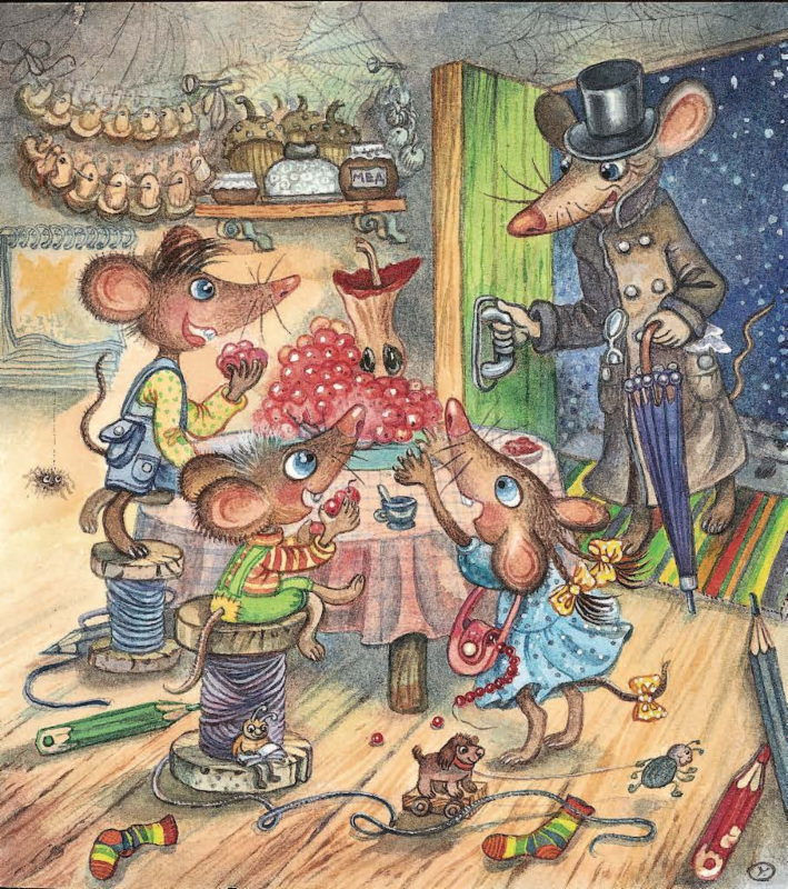 Госпожа Куцехвост накрыла стол старенькой скатертью (все новые были уже уложены) и расставила тарелки. Господин Куцехвост молча достал из карманов красные ягоды рябины и пересыпал их в миску. Она получилась полная, даже с верхом. Дети с визгом набросились на угощение.