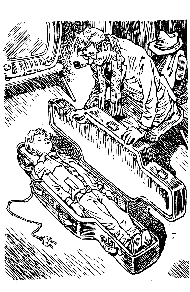 Он нагнулся над чемоданом, отпер замки, откинул крышку. В чемодане, на мягком голубом нейлоне, лежал, вытянувшись во весь рост, мальчик с закрытыми глазами. Казалось, он крепко спит. Несколько минут профессор смотрел на спящего. Нет, ни один человек не мог бы сразу догадаться, что перед ним кибернетический мальчик. Курносый нос, вихор на макушке, длинные ресницы... Синяя курточка, рубашка, летние брюки. Сотни, тысячи таких мальчишек бегают по улицам большого города.