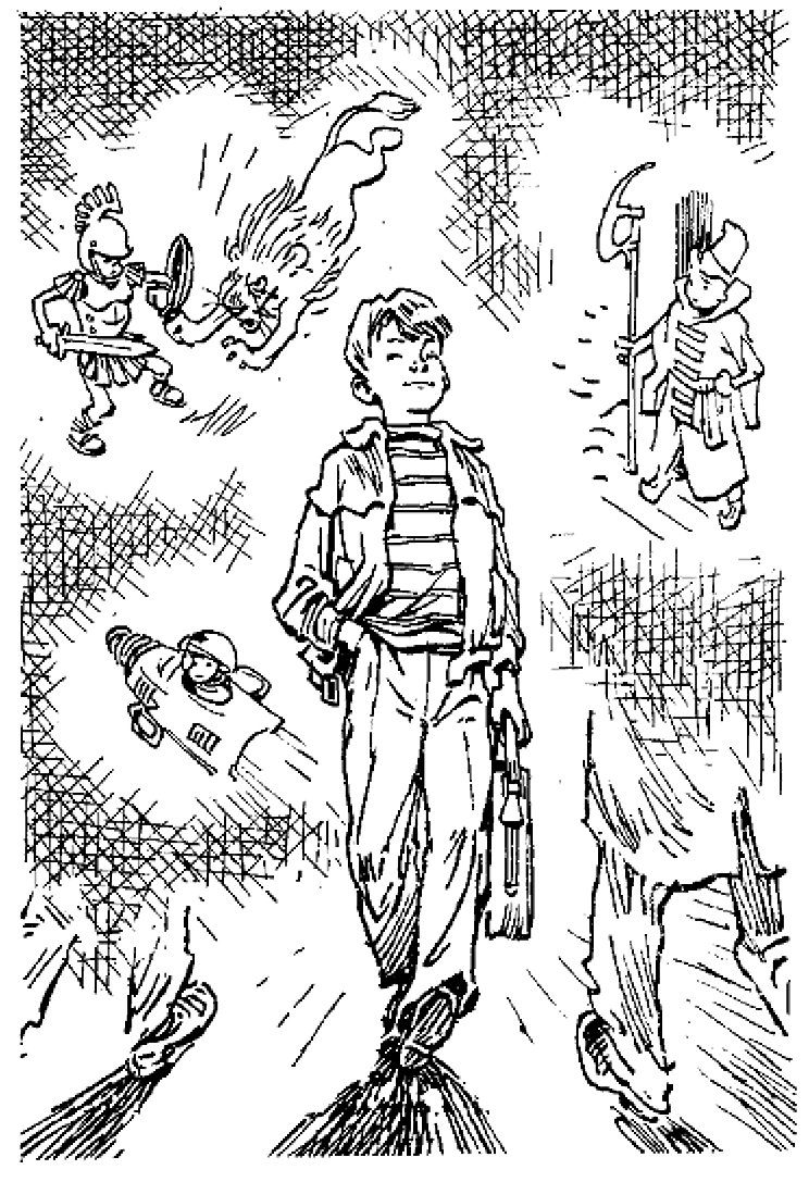 Сыроежкин строил планы мести и один за другим отвергал их. Лассо, которым можно заарканить и привязать врага к дереву, нападение в темноте, даже помощь приятелей — десять крепких кулаков — все это Сергею не нравилось. Оставалось найти чудодейственные капли, удесятеряющие силы человека, и вызвать обидчика на бой. Но где достанешь их рецепт?