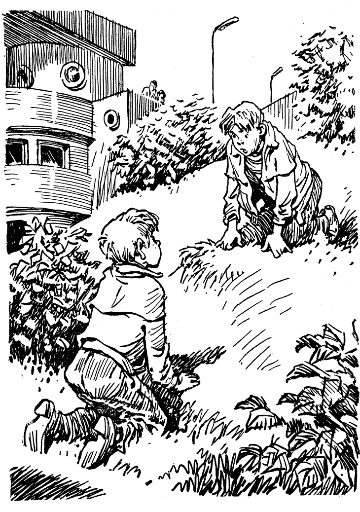 Во дворе на футбольном поле резвились малыши. Все ясно: зарядку он пропустил. Совсем неплохо было бы побегать с мячом, но что поделаешь, его задержал не кто-нибудь, а античеловек! И Сережка, как только свернул за угол, понял, что это открытие принесет ему славу. У крайнего подъезда он заметил ребят. Раз собрались, значит, что-то обсуждают или меняются ценностями.