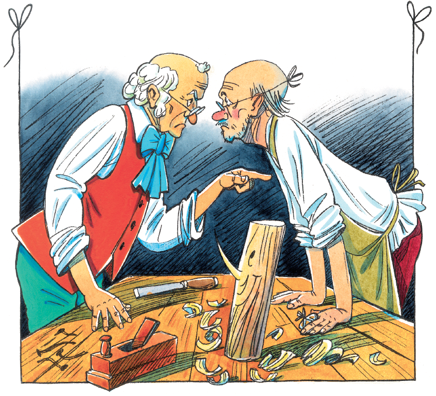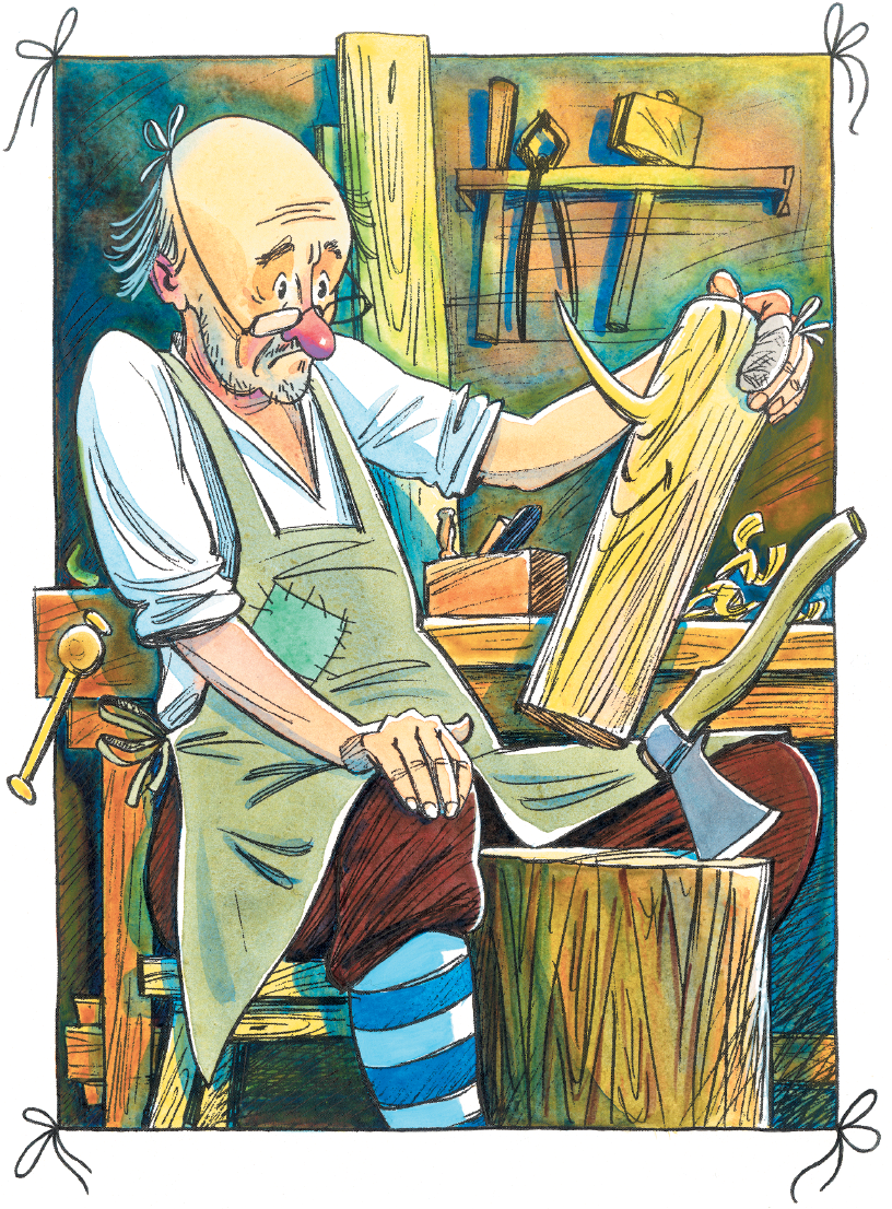 Джузеппе надел очки, обмотанные бечёвкой, так как очки были тоже старые, повертел в руке полено и начал его тесать топориком. Но только он начал тесать, чей-то необыкновенно тоненький голосок пропищал: