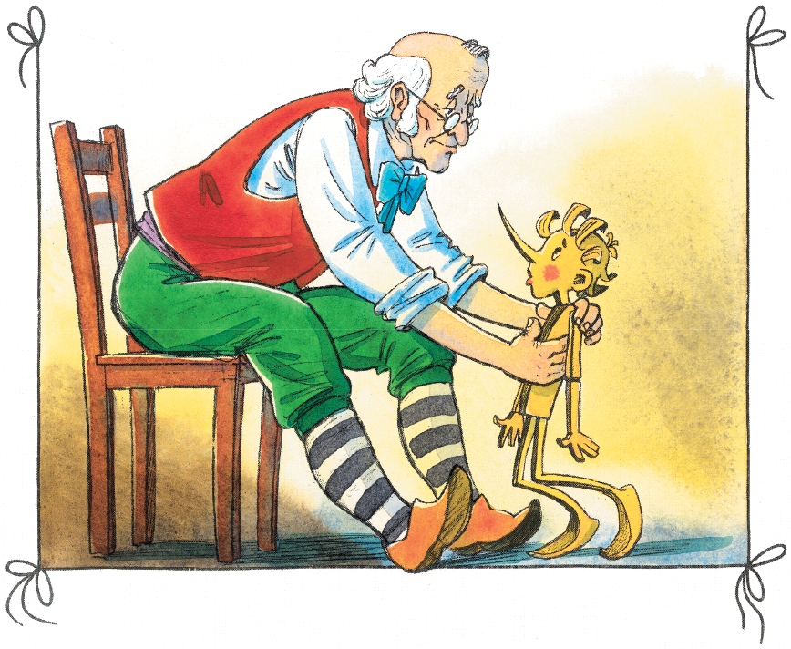 Карло сделал ему из лучинок длинные ноги с большими ступнями. На этом окончив работу, поставил деревянного мальчишку на пол, чтобы научить ходить.