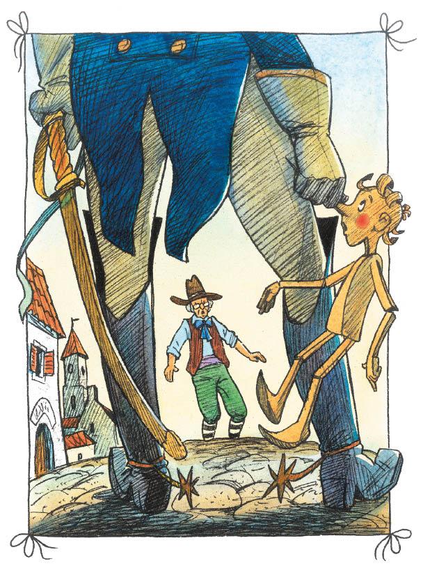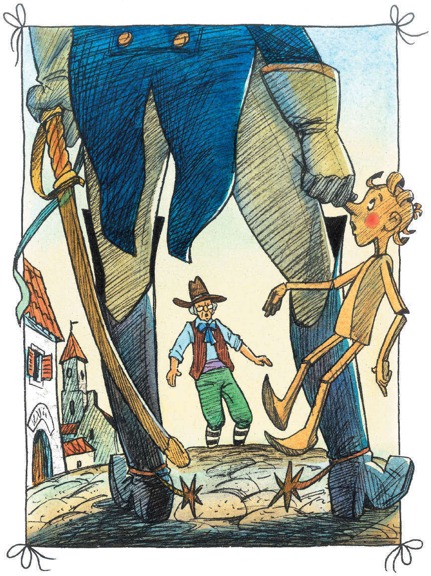 Увидев бегущего деревянного человечка, он широко расставил ноги, загородив ими всю улицу. Буратино хотел проскочить у него между ног, но полицейский схватил его за нос и так держал, покуда не подоспел папа Карло.