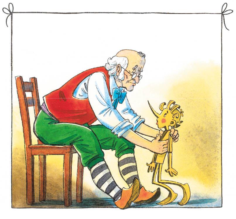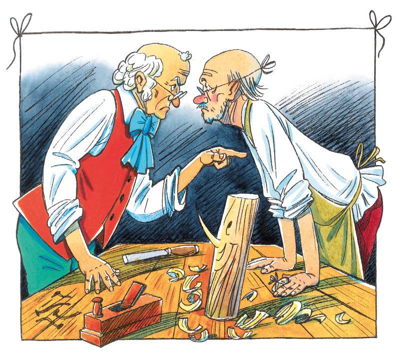 Карло, уже не обращая внимания на эти проделки, продолжал строгать, вырезывать, ковырять… Сделал кукле подбородок, шею, плечи, туловище, руки… Но едва окончил выстругивать последний пальчик, Буратино начал колотить кулачками Карло по лысине, щипаться и щекотаться.