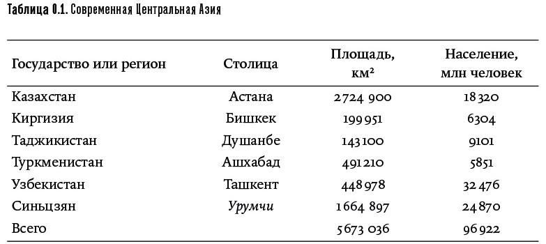 Источник: данные о численности населения пяти суверенных государств, по оценке Организации Объединенных Наций, в середине 2018 года (United Nations, United Nations Demographic Yearbook 2018 [New York: United Nations, 2019], 693); данные по Синьцзяну на конец 2018 года (China Statistical Yearbook 2019 [Beijing: China Statistics Press, 2019], table 2–6)