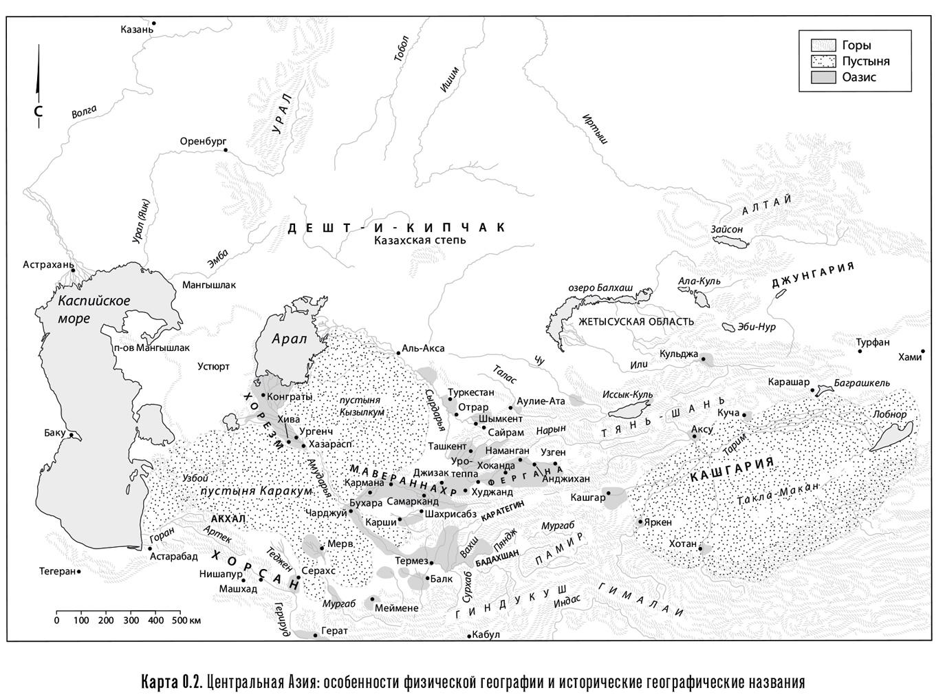 Мы летим дальше на восток — и в какой-то момент обнаруживаем самую большую горную систему в мире. На юго-востоке лежит Памирский горный узел, так называемая «крыша мира», где сходится несколько горных цепей. С юго-запада тянется цепь вулканов, где находится кратер Дарваза, на восток уходят горы Каракорум и Гималаи, а хребет Тянь-Шань (по-китайски «Небесные горы») простирается на север. Это труднодоступная местность, отделяющая Центральную Азию от Южной. Кроме того, Тянь-Шань делит Центральную Азию в продольном направлении на западную и восточную половины. Теперь давайте посмотрим, что видно на западе. К северо-востоку от Памира лежит Ферганская долина, с трех сторон окруженная горами. Западные предгорья Тянь-Шаня — изобильная земля, орошаемая притоками Сырдарьи, которые и дали этому району его название: Жети-Суу на киргизском, Жетісу на казахском, что на русский переводится как Семиречье. К северу от Сырдарьи мы обнаружим собственно степь, обширную, в основном равнинную местность с пастбищами и пустынями, которая тянется на север до самой сибирской тайги. В средневековых исламских источниках она упоминается под именем Дешт-и-Кипчак (Кипчакская степь), в честь тюркских кочевников, обитавших здесь в то время. Говоря о современном периоде истории, имеет смысл называть ее Казахской степью, так как с начала этого периода ее населяют казахи. Бо́льшая часть степи представляет собой плато, центральная часть которого известна под названием Бетпак-Дала (Северная Голодная степь) — указание на то, что людям, которые пытались здесь селиться, приходилось нелегко. К востоку от Семиречья мы обнаружим Джунгарскую впадину, названную в честь кочевого народа, населявшего ее до XVIII века. (Джунгары играют важную роль в начале той части истории, которую охватывает эта книга.) Они относились к монголам и так и не приняли ислам. В степных пастбищах Джунгарии располагается континентальный полюс недоступности. Его южную границу образует хребет Тянь-Шань, к югу от которого находится еще один крупный водосборный бассейн — река Тарим. Тарим берет начало в горах Каракорума и раньше впадал в озеро Лобнор. Бо́льшая часть его бассейна представляет собой еще одну пустыню — Такла-Макан. Она усеяна плодородными оазисами, где в древности возникали города. Бассейн Тарима еще называют Алтышаром (Шестиградием, с отсылкой к городам-оазисам), а также Восточным Туркестаном. На юге от Тибетского плато его отделяют горы Куньлунь. К востоку лежит Турфанская впадина, разлом, в котором поместились оазисы Турфан и Хами (Кумул). Это одна из самых глубоких впадин в мире, расположенная на 155 м ниже уровня моря. Здесь очень жаркий и засушливый климат, однако благодаря подземным водам здесь возможно орошаемое земледелие. Мы оказались на другом конце Центральной Азии, поскольку на востоке бассейн Турфана соединяется с коридором Хэси, или Ганьсу, цепочкой оазисов вдоль узкой тропы между горами Куньлунь на юге и пустыней Гоби на севере, спускающейся к долине реки Хуанхэ (Желтой реки) в Китай. В центральноазиатских источниках земли за пределами региона называются по-разному: Хитай — область к северу от реки Хуанхэ, некогда земли киданей; Чин — регион, расположенный к югу от реки; Мачин — территория южнее реки Янцзы. Жители Турфанского бассейна на восточном краю Центральной Азии до