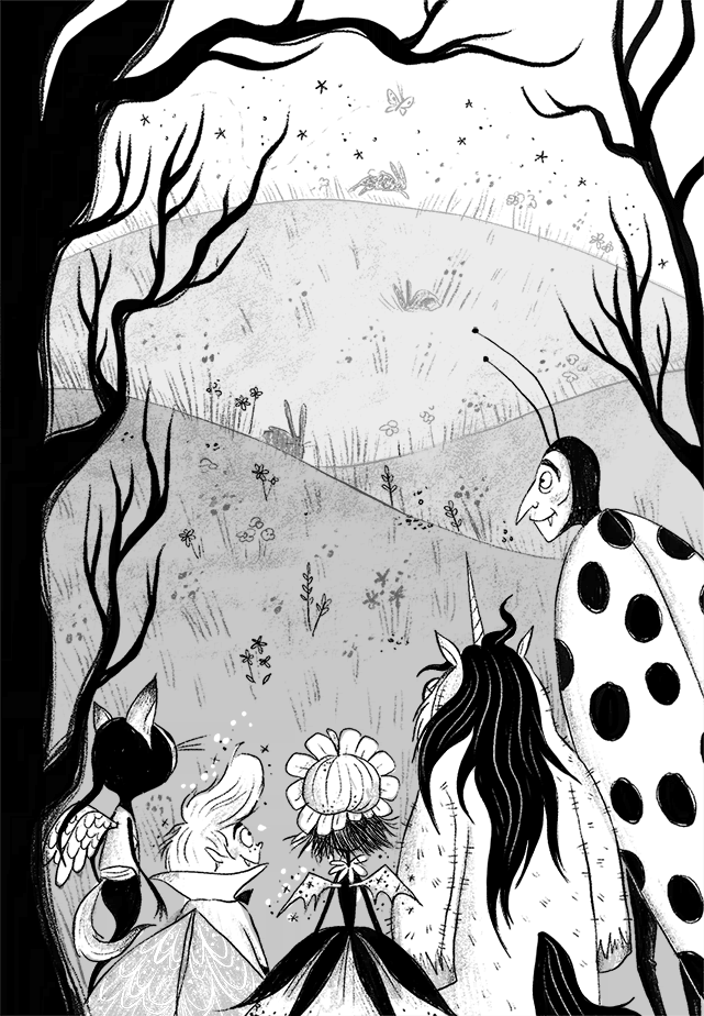 Развернувшийся перед друзьями пейзаж резко контрастировал с чахлыми серыми деревьями и мёртвыми ветвями Безжизненного леса. Впереди простирался залитый ярким солнцем зелёный луг, усеянный разноцветными цветами.