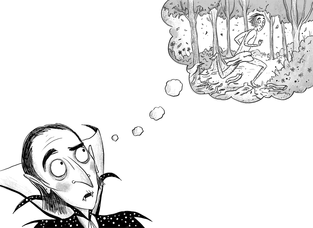 Амелия с друзьями уже шагали по коридору особняка семьи Клык, как вдруг до них донёсся взрыв хохота и громкое рыгание. Папа Амелии, граф Драк Третий, медленно выплыл из столовой, предшествуемый собственным задом, поднятым значительно выше корпуса.
