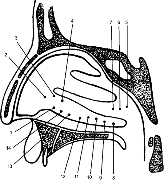 Схема связи носа с органами и системами (по В. Вогралик, 1998) Проекционные зоны: 1 – сердце; 2 – бронхи и легкие; 3 – мочевой пузырь; 4 – седалищный нерв; 5 – желудок; 6 – внутреннее ухо; 7 – печень; 8 – поджелудочная железа; 9 – почки; 10 – толстый кишечник; 11 – тонкий кишечник; 12 – прямая кишка; 13 – эндокринная система; 14 – половые железы
