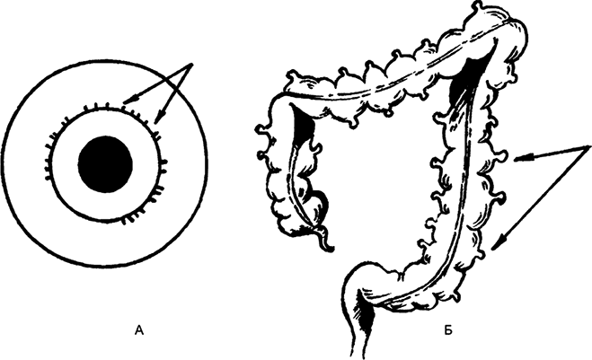 Тотальный дивертикулез ободочной кишки (B. Iensen, 1964): А – радужка; Б – толстая кишка