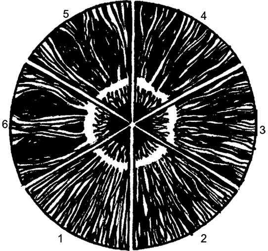 Кольцевая топография радужки (по Е. С. Вельховеру): 1 – парасимпатическая система; 2 – желудочная секреция; 3 – желудок; 4 – кишечник; 5 – позвоночник; 6 – магистральные сосуды, железы внутренней секреции; 7 – органы; 8 – мелкие сосуды, лимфатическая система; 9 – кожа