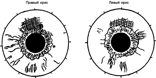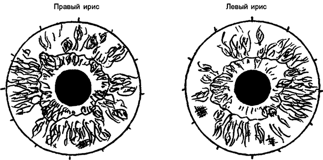 Вспоминаю пациентку 38 лет. Ей был поставлен вышеуказанный диагноз, рекомендован отдых, седативные препараты, только ухудшившие ее состояние. Иридодиагностически отмечены явления атонического колита, раздраженная правая почка, выраженная «зашлакованность». Предложены очистительные процедуры, активация биологически активных зон массажем (лица, ушей, ладоней, стоп), упорядочен режим питания и быта. Состояние больной после этого значительно улучшилось. Недаром врачи (а может быть, пациенты) шутят по поводу некоторых диагнозов «на нервной почве» – «почва-то нервная, но цветочки на ней растут разные…».