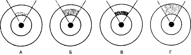 Различные степени и тоника понижений мозгового кровотока: А – понижение мозгового кровотока I степени в гипоталамо-стволовых отделах; Б – понижение мозгового кровотока I степени в гипоталамо-стволовых и подкорковых отделах; В – понижение мозгового кровотока II степени в гипоталамо-стволовых отделах; Г – тотальное понижение кровотока I степени в соответствующем полушарии