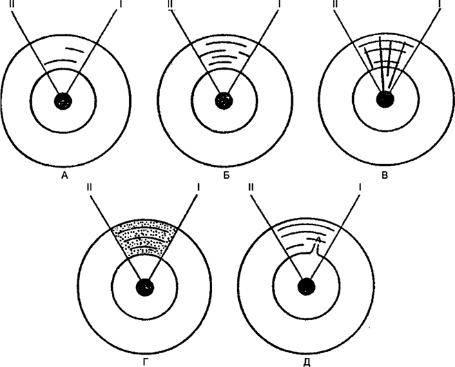 Наиболее типичные формы зрачковой каймы (B. Iensen, 1964): I – равномерно утолщенная; II – равномерно зернистая; III – ореолоподобная; IV – неравномерно утолщенная; V – неравномерно зернистая; VI – тонкая