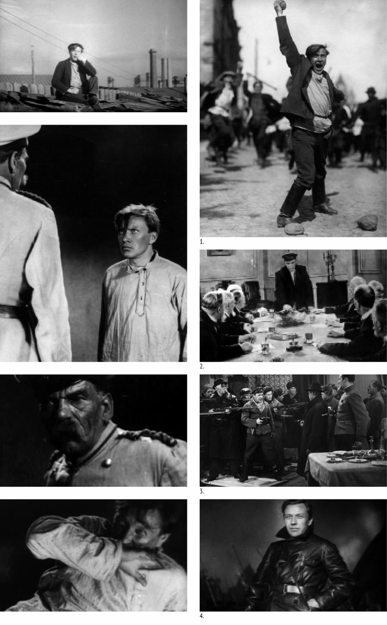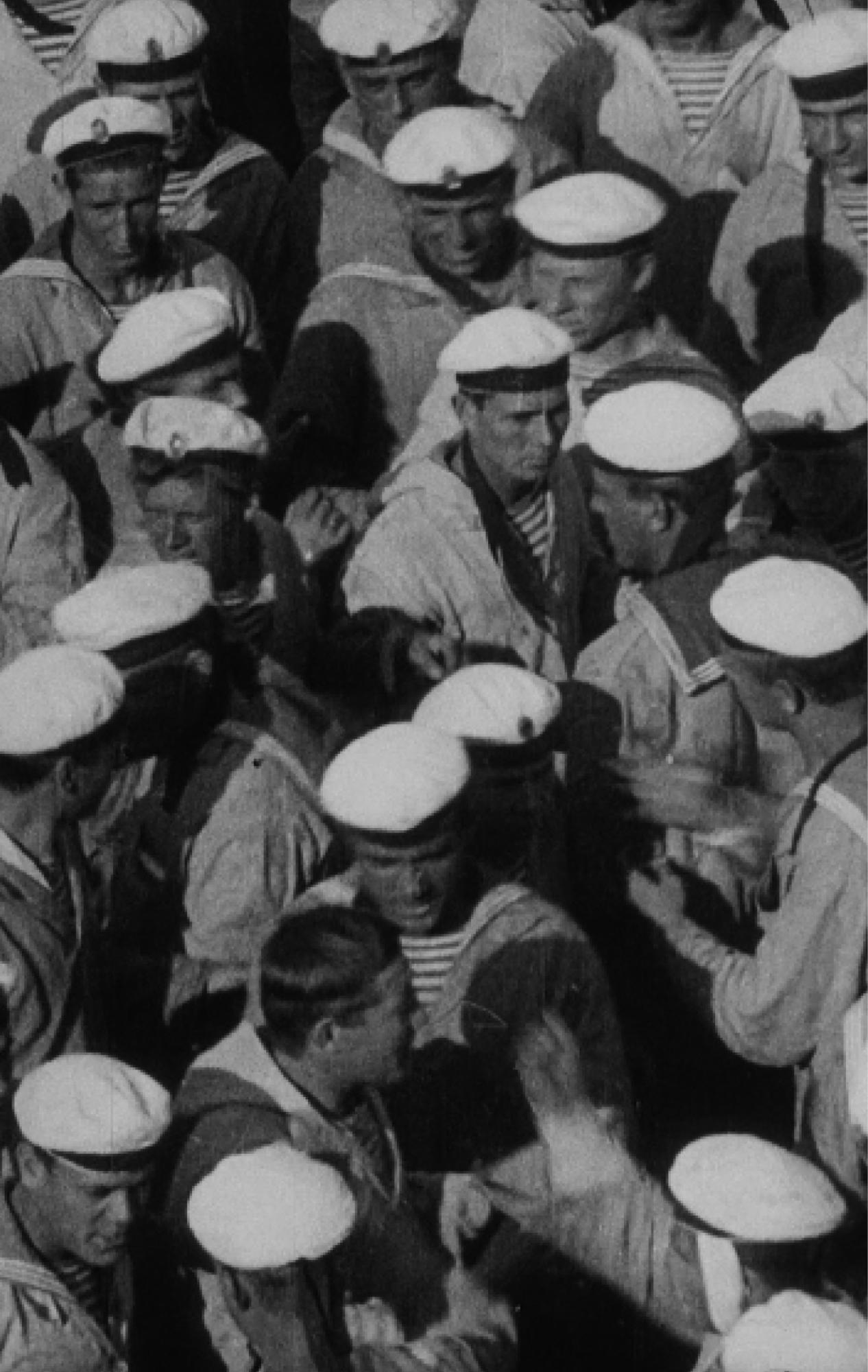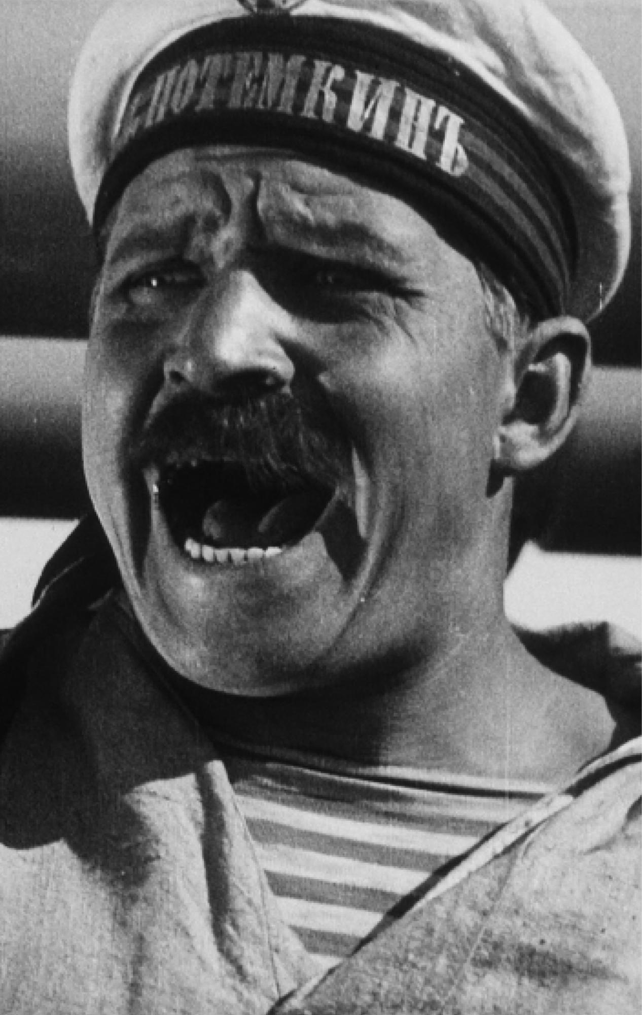 Соответственно живое лицо в его обязательной — ибо сюжетно значимой — смене выражений практически неизбежно концентрирует в себе противоположный смысл: будь то Вакулинчук, медленно поднимающий лицо вверх, пред тем как бросить клич восстания, или матрос в финальной встрече с эскадрой, у которого смертельное напряжение в лице переходит в радостную улыбку: «Братья!»