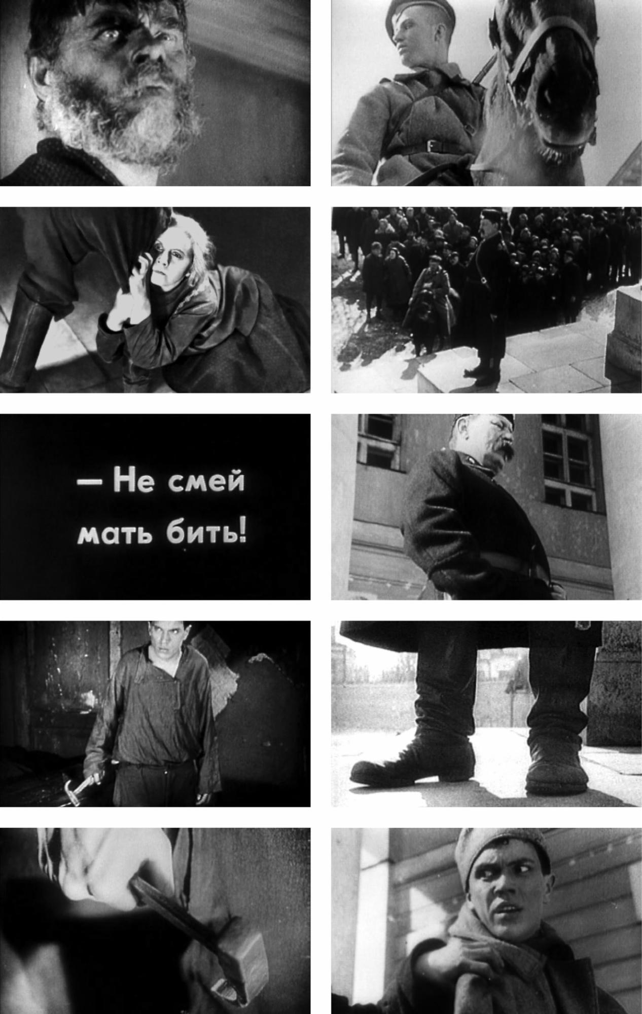 [25] Отсюда постоянный контраст и в «Потемкине», и в кинематографе Эйзенштейна в целом между органикой персонажей из массовки и заведомой условностью поведения отрицательных персонажей.
