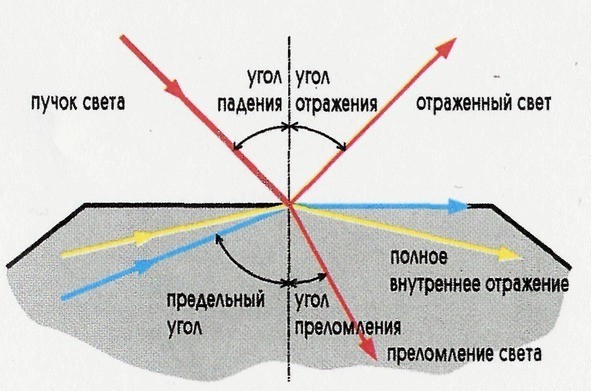 Когда пучок света переходит из среды с одной оптической плотностью в другую (например, из воздуха в кристалл), происходит его преломление.