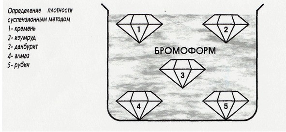 Плотность минерала, определяемая в метрической системе как отношение массы к объему, традиционно используется в диагностике драгоценных камней, поскольку эта константа почти не меняется от образца к образцу. Суспензионный метод определения плотности минералов наиболее точный и быстрый. Образец помещают в жидкость с известной плотностью, если он всплывает, его плотность меньше, чем плотность жидкости; если тонет – плотность больше. При соответствующем наборе тяжелых жидкостей с эталонированной плотностью можно легко определить плотность довольно большого числа минералов. Для прецизионных измерений плотности обычно используют метод двойного взвешивания, когда один раз взвешивают образец на воздухе, а второй раз – в воде.