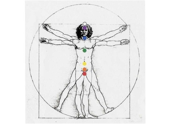 Расположение чакр (сверху вниз): чакра темени (белая), лобная (фиолетовая), горловая (синяя), сердечная (зеленая), пупочная (желтая), сакральная (оранжевая), нижняя (красная).
