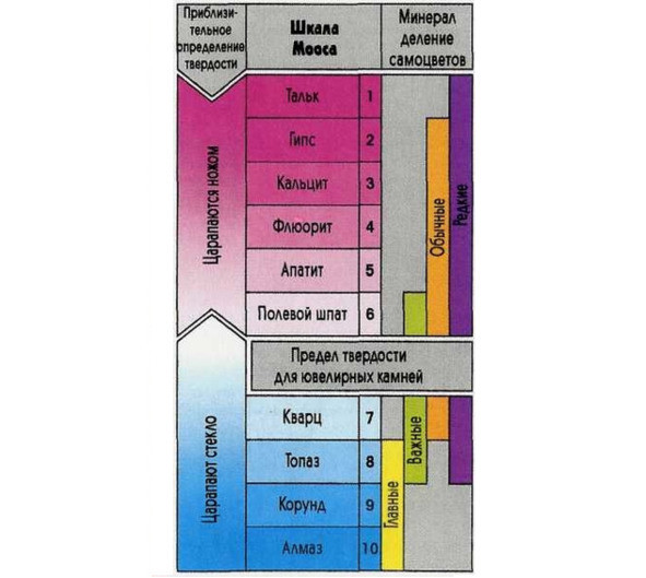 Фридрих Моос (1773—1839) предложил относительную 10-ступенчатую шкалу твердости (которой пользуются до сих пор), где каждый из минералов, представляющих собой градации твердости, царапает предшествующий: 1 – тальк, 2 – гипс, 3 – кальцит, 4 – флюорит, 5 – апатит, 6 – полевой шпат, 7 – кварц, 8 – топаз, 9 – корунд, 10 – алмаз (эти значения действительны для данных минералов в чистом виде). На практике удобно разделять минералы по твердости на четыре группы: 1) мягкие (твердость меньше 2,5) – в большей или меньшей степени царапаются ногтем); 2) средней твердости (от 2,5 до 5,5—6) – оставляют царапину на ногте; царапаются ножом или осколком стекла; 3) твердые (5,5—6) – царапают стекло или лезвие ножа; 4) очень твердые (> 7) – царапают кварц.