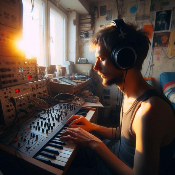 Никита, более известный под своим сценическим псевдонимом «Мотыль», сидел в своей крошечной спальне, захламленной синтезаторами, проводами и старыми пластинками. Жаркое солнце июньского утра проникало сквозь приоткрытое окно, мягко освещая его сосредоточенное лицо. Наушники плотно обхватывали его уши, отгораживая от внешнего мира и позволяя полностью погрузиться в мир звуков.