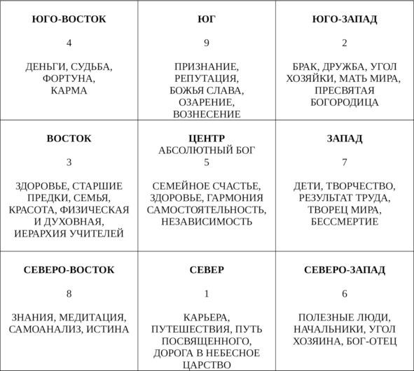 Из школы компаса известно, что каждый человек имеет свои лучшие и худшие направления. По общему багуа каждое направление за что-то отвечает (например, север — за карьеру, юго-запад — за брак и т. д.). Проводя исследования, я пришла к выводу, что причина жизненной неудачи человека, а именно — выполнение миссии Творца, — кроется в том, что человек эксплуатирует свои не лучшие направления в жизни. Мы будем пользоваться двумя понятиями: понятием багуа и понятием удачных и неудачных направлений в фэншуй, а потом для каждого человека будет расписана индивидуальная цепочка удачи.
