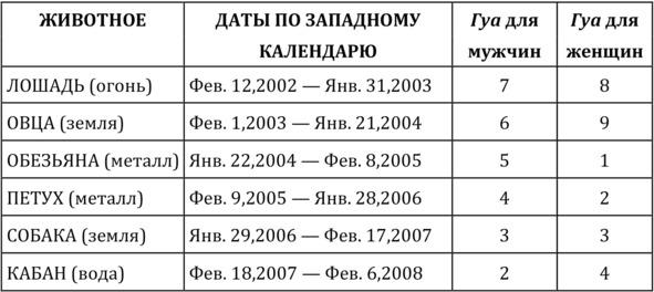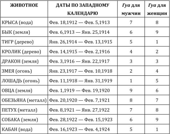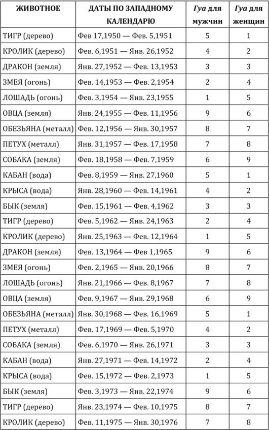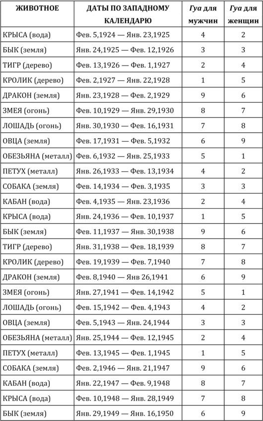 Числа гуа бывают мужские и женские, поэтому в первой колонке будут числа гуа для мужчин, а во второй — для женщин.