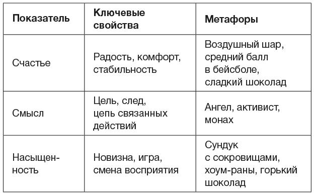 Таблица 1. Ключевые свойства и метафоры счастья, смысла и психологической насыщенности