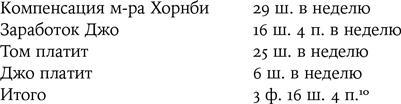 В доме на первом этаже две комнаты и кухня, на втором — три комнаты; крохотный дворик сзади, и там уборная. Горячая вода не подведена. Дом запущен, фасадную стену вспучило. Арендная плата — 12 ш., с коммунальным налогом — 14 ш. Общий доход семьи Хорнби: