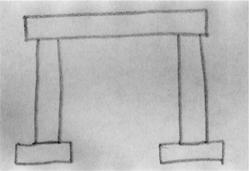 Внизу оказалось светлее, чем я ожидал: кроме ламп, которые были у каждого из нас, в квершлагах постоянные электрические лампы. Но чего я еще меньше ожидал — это низкие потолки. Я смутно представлял себе нечто вроде туннелей метро, но на самом деле там очень мало мест, где ты можешь выпрямиться. Высота потолка обычно 4 фута или 4 фута с половиной, иногда гораздо меньше, и то и дело встречается балка толще других, так что надо сгибаться под ней в три погибели. Местами стены ровные, почти как каменные стенки в Дербишире, — пласты сланцевой глины. Крепежные стойки почти все деревянные, тонкие бревна лиственницы нужной длины (увидев, сколько их, я понял, почему люди, закладывая плантации, почти всегда сажают лиственницу). Балка просто кладется на стойки, стойки опираются на деревянные лафеты вот так:
