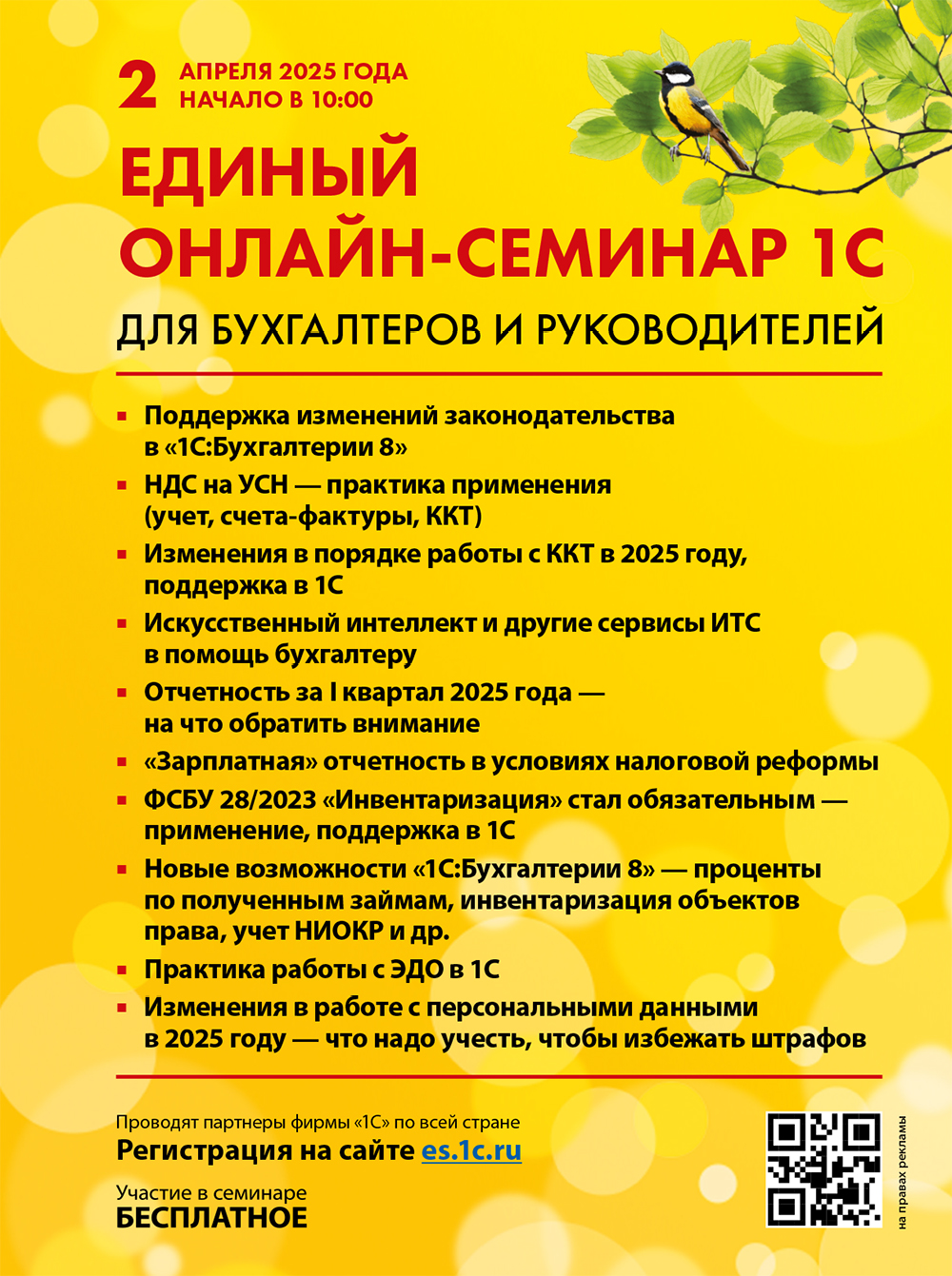 В ходе семинара эксперты фирмы «1С» расскажут о важных изменениях законодательства с 2025 года и их поддержке в программах системы «1С:Предприятие 8»: НДС на УСН — практика применения (учет, счета-фактуры, ККТ); изменения в порядке работы с ККТ в 2025 году; искусственный интеллект и другие сервисы ИТС в помощь бухгалтеру; отчетность за I квартал 2025 в условиях налоговой реформы; ФСБУ 28/2023 «Инвентаризация», практика работы в 1С-ЭДО; изменения в работе с персональными данными (152-ФЗ).