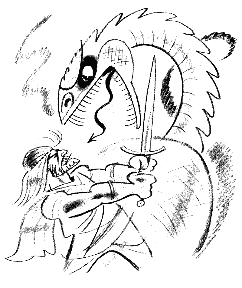 The people were looking at the tracks of the terrible stranger on the floor of the hall. They knew that it was Grendel. “He will come again and again,” they said. “We are not safe here now.” Hrothgar and his people, helpless against Grendel’s attacks, abandoned Heorot. No champion would face the monster, and the Danes, in despair, deserted the glorious hall of which they had been so proud. Many of the thanes were frightened, and ran away and hid themselves in places where they thought the monster could not find them.