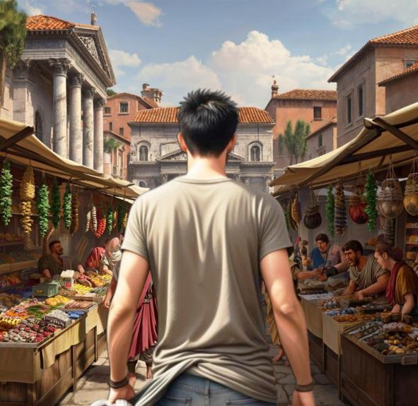 Узкая улочка, вымощенная крупными булыжниками (явно не по ГОСТу, подумал он машинально), кишела людьми. Мужчины в просторных туниках до колен, некоторые — с пурпурными полосами, женщины в длинных столах и паллах, «Стоп! Откуда ему известны эти слова?», детишки в мини-копиях взрослой одежды. Повсюду лотки: с рыбой, мясом, овощами, странными лепёшками, глиняной посудой. Воздух дрожал от криков торговцев, споров, смеха и всепроникающего гула голосов. И запах… Запах был концентрированным, как спиртовая настойка истории: человеческий пот, жареное сало, специи, вино, конский навоз и подозрительно знакомый аромат общественного туалета, который явно где-то рядом.
