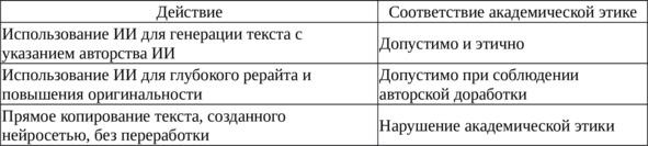 Использование искусственного интеллекта должно происходить в строгом соответствии с академической этикой, таблица 5. Понятие честного интеллектуального соавторства предполагает прозрачность методов работы с нейросетью, точное указание доли участия ИИ и обязательную проверку качества и достоверности полученных текстов. Нарушением же академической этики считается прямое копирование текстов, сгенерированных ИИ, без последующей обработки и авторского анализа, поскольку это может привести к санкциям со стороны комиссии по защите и автоматизированных систем проверки на плагиат.