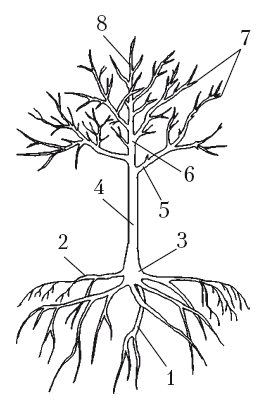 Основные части взрослого плодового дерева: 1– вертикальный корень; 2 – горизонтальный корень; 3 – корневая шейка; 4 – штамб; 5 – основная скелетная ветвь; 6 – проводник; 7 – обрастающие ветки; 8 – ветвь продолжения