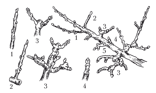 Обрастающие веточки семечковых культур (яблоня): 1 – прутик; 2 – копьеца; 3 – плодуха; 4 – кольчатка; 5 – плодоносная (плодовая) сумка