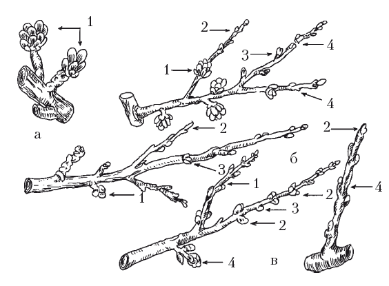 Обрастающие веточки косточковых культур: а – вишня (1 – букетные веточки; 2 – проросшая букетная веточка; 3 – генеративные почки на однолетней ветке; 4 – вегетативные почки); б – слива (1 – обрастающие веточки типа букетных; 2 – вегетативные почки; 3 – групповые почки; 4 – шпорцы); в – персик (1 – генеративная ветка; 2 – групповые почки; 3 – смешанная ветка; 4 – букетные веточки)