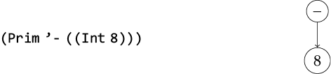 Целочисленный узел содержит только целое значение. Мы будем использовать соглашение, в соответствии с которым имена структур (такие, как Int) записываются с прописной буквы. Чтобы создать узел AST для целого числа 8, используется запись (Int 8).