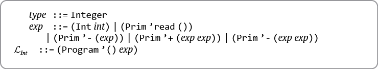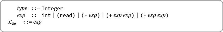 Если имеется AST, к которому эти правила неприменимы, то AST не принадлежит LInt. Например, программа (* (read) 8) не принадлежит LInt, потому что правила для оператора * не существует. Когда мы определяем язык грамматикой, язык включает только те программы, которые соответствуют правилам грамматики.