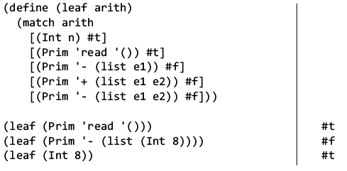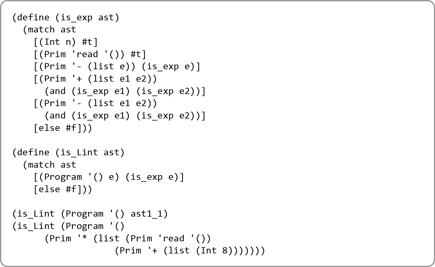 Программы рекурсивны по своей природе. Например, выражение часто состоит из нескольких меньших подвыражений. Таким образом, можно рассматривать рекурсивную функцию как естественный метод обработки всей программы. В качестве первого примера такой рекурсивной функции определим функцию is_exp, как показано на илл. 1.3; она получает произвольное значение и определяет, является ли оно выражением в LInt. Говорят, что функция определяется структурной рекурсией, если для ее определения используется последовательность условий match, соответствующих грамматике, а тело каждого условия содержит рекурсивный вызов к каждому дочернему узлу6. Иллюстрация 1.3 также содержит определение функции is_Lint, устанавливающей, является ли AST программой в языке LInt. В общем случае можно написать одну рекурсивную функцию для обработки каждого нетерминального элемента в грамматике. Из двух примеров в нижней части листинга первый принадлежит LInt, а второй нет.