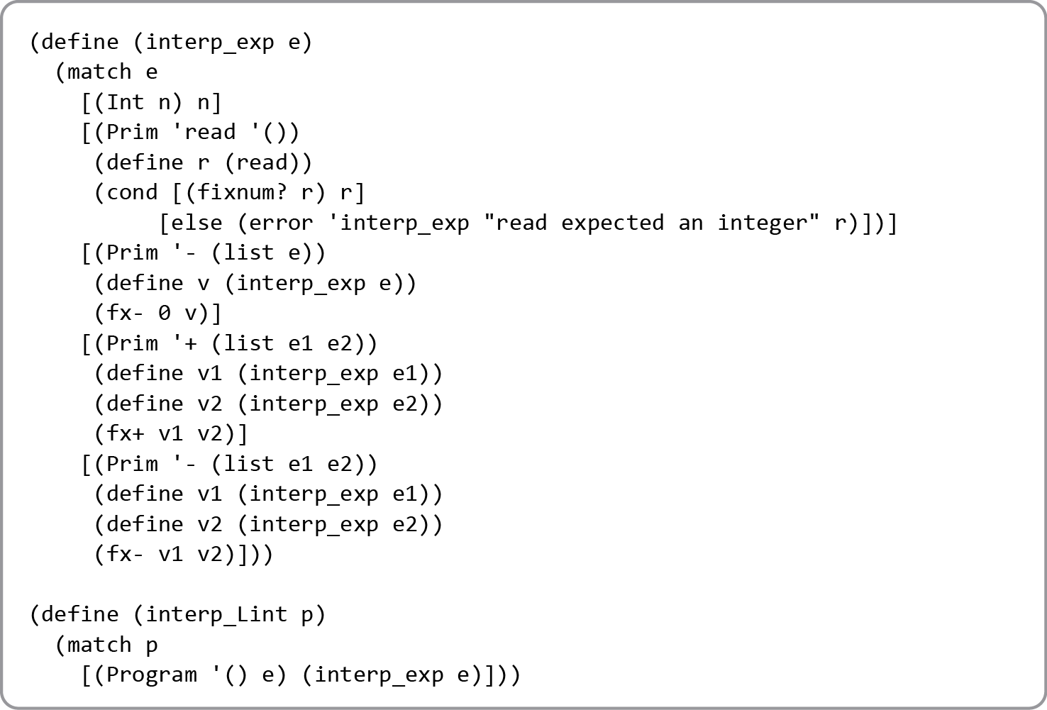 Поведение программы определяется спецификацией языка программирования. Например, язык Scheme определяется в докладе Спербера и др. (Sperber et al.) (2009). Язык Racket определяется в его справочном руководстве (Flatt and PLT, 2014). В этой книге для определения каждого рассматриваемого языка будут использоваться интерпретаторы. Интерпретатор, спроектированный как определение языка, называется определительным интерпретатором (definitional interpreter) (Reynolds, 1972). Начнем с создания определительного интерпретатора для языка LInt. Этот интерпретатор служит вторым примером структурной рекурсии. Определение функции interp_Lint приведено на илл. 1.4. Тело функции содержит вызов match для входной программы, за которым следует вызов вспомогательной функции interp_exp. В свою очередь, эта функция содержит отдельное условие match для каждого правила грамматики для выражений LInt.