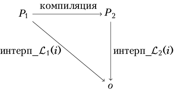 Задача компилятора – преобразовать программу на одном языке в программу на другом языке, чтобы выходная программа обладала таким же поведением, как исходная. Этот принцип представлен на следующей диаграмме. Допустим, имеются два языка, L1 и L2, и определительный интерпретатор для каждого языка. Если имеется компилятор, преобразующий программу из языка L1 в L2, и некоторая программа P1 на L1, компилятор должен преобразовать ее в программу P2 такую, что интерпретация P1 и P2 соответствующими интерпретаторами с одинаковыми входными данными приведет к одинаковым результатам o.