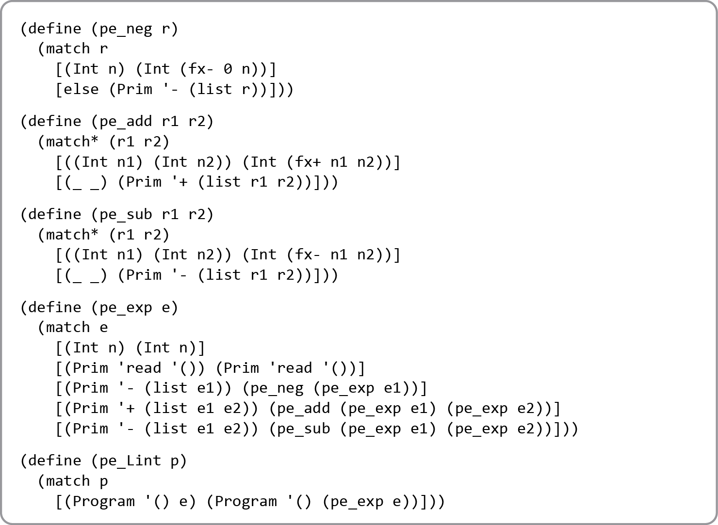На илл. 1.5 приведен код простого частичного вычислителя для языка LInt. Выводом частичного вычислителя является программа на LInt. На илл. 1.5 структурная рекурсия по exp отражена в функции pe_exp, тогда как код частичного вычисления операций изменения знака и сложения распределяется по трем вспомогательным функциям: pe_neg, pe_add и pe_sub. Вводом для этих функций является вывод частичного вычисления дочерних узлов. Функции pe_neg, pe_add и pe_sub проверяют, являются ли их аргументы целыми числами, и если да, выполняют соответствующие арифметические вычисления. В противном случае они создают узел AST для арифметической операции.