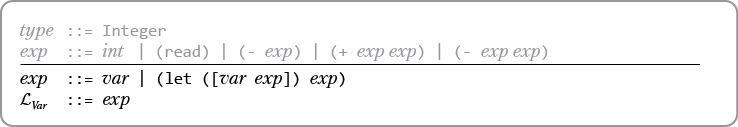 Язык LVar расширяет язык LInt, добавляя в него переменные. Конкретный синтаксис языка LVar определяется грамматикой, представленной на илл. 2.1, и абстрактным синтаксисом, представленным на илл. 2.2. Нетерминальный элемент var может быть любым идентификатором Racket. Как и в случае с LInt, оператор read является нулевым, оператор «-» — унарным, а «+» — бинарным. По аналогии с LInt абстрактный синтаксис LVar включает структуру Program для обозначения начала программы. Несмотря на простоту языка LVar, его возможностей достаточно для демонстрации некоторых методов компиляции.
